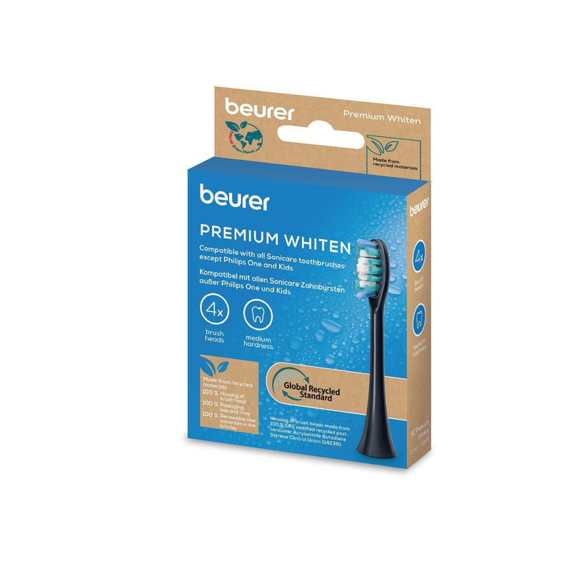 Sada 4 náhradních kartáčků Beurer Premium Whiten pro SC30/SC50. Kompatibilní se Sonicare, s bělicím účinkem, střední tvrdostí a recyklovaným provedením.